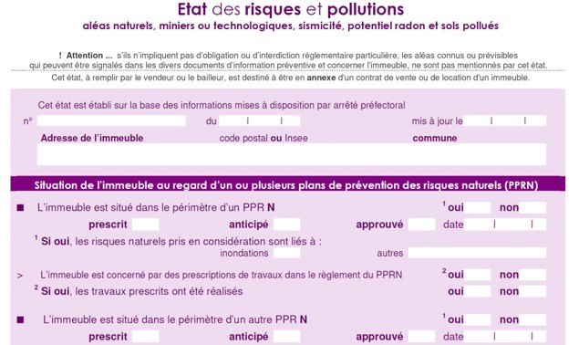 Un diagnostic état des risques et pollutions (ERP) doit être joint à la promesse de vente ou à l'acte de vente ou au bail dans les communes concernées. Le futur acheteur ou locataire est informé des risques et pollutions auxquels le logement est exposé.